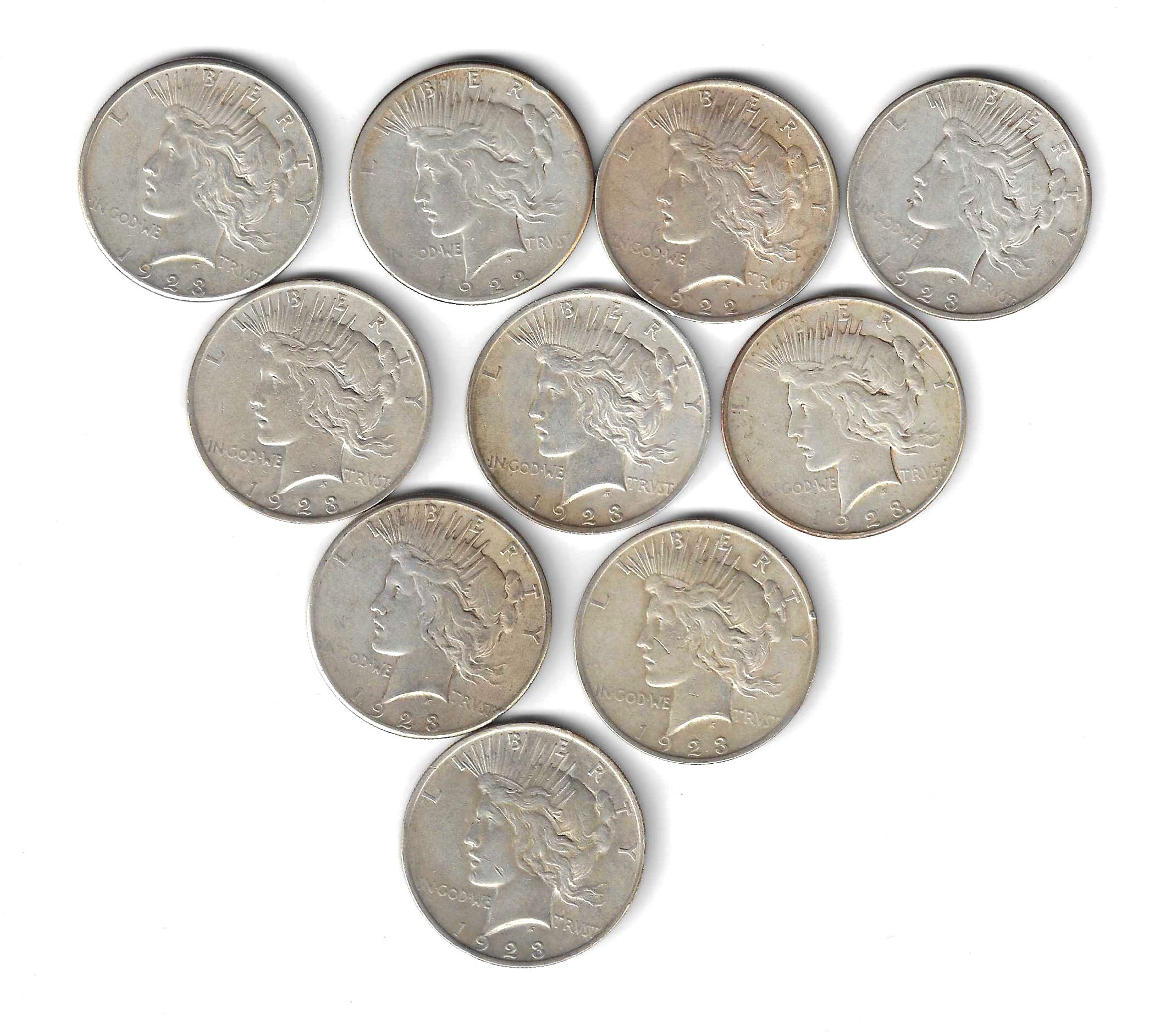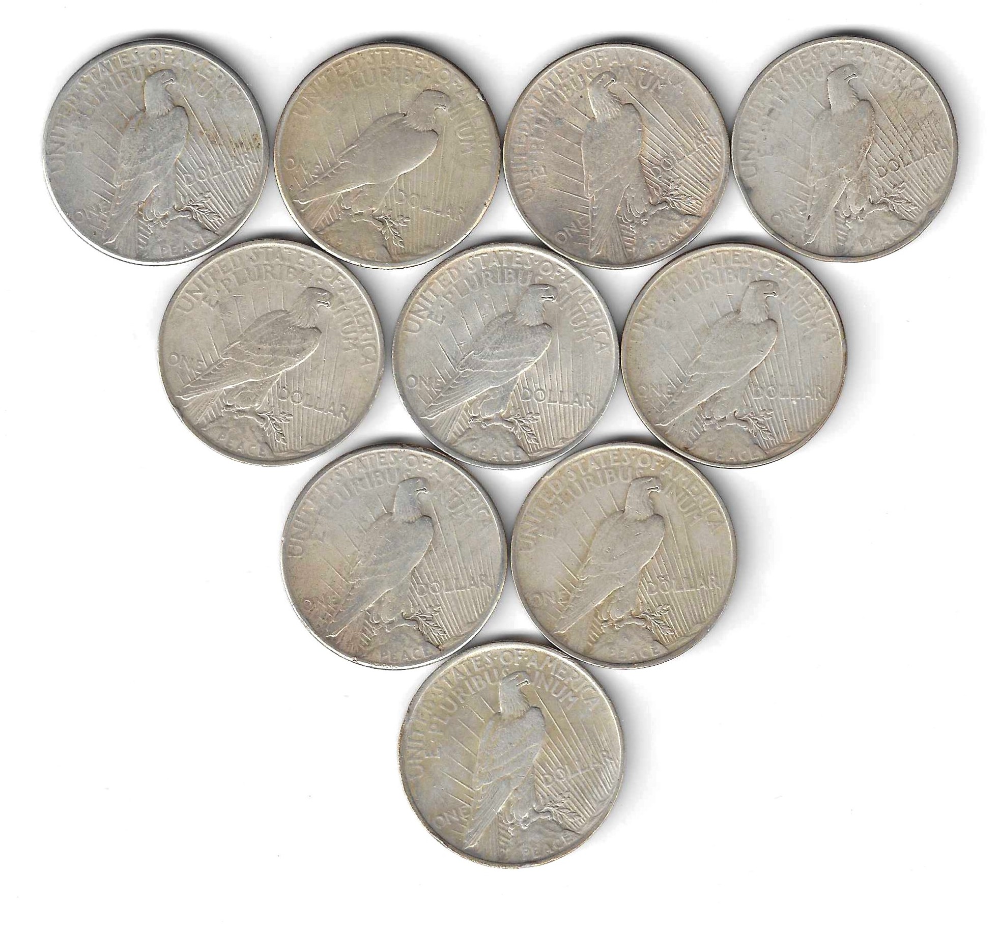 Lot of Ten (10) US Peace Silver Dollars-Nice Collector Grade Coins, Offered is a lot of ten (10) US Peace Silver Dollars. Each American Morgan or Peace dollar contains 0.7734 ASW.