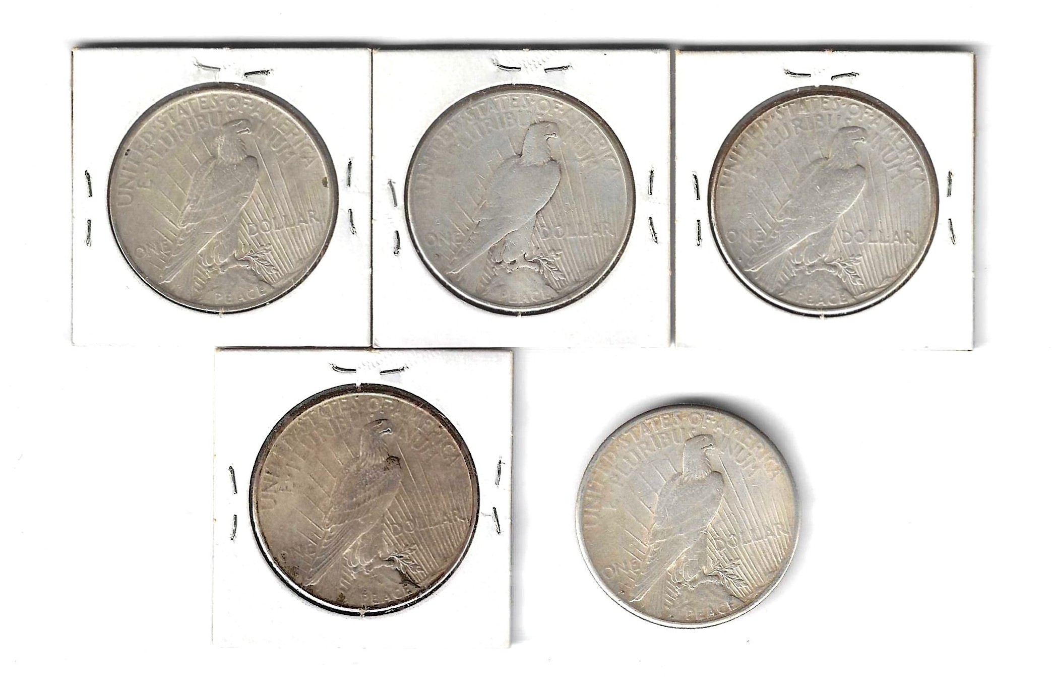 Offered is a lot of five (5) US Peace Silver Dollars. Each American Morgan or Peace dollar contains 0.7734 ASW.